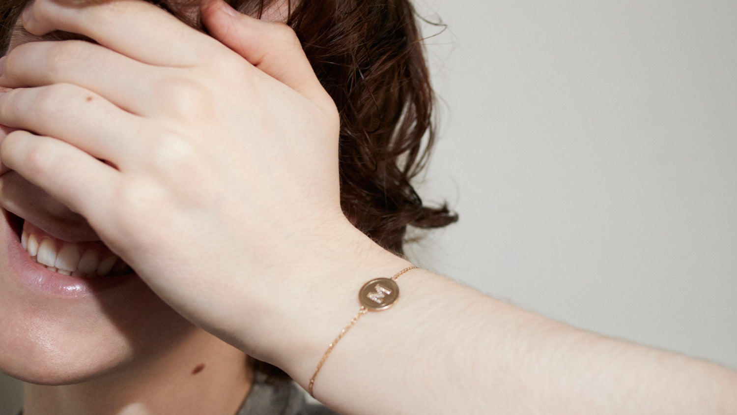 プレートネックレスの着想源から作られたlove is you.のブレスレットは、自分にとって大事な一文字を手首にあしらうプレート型。